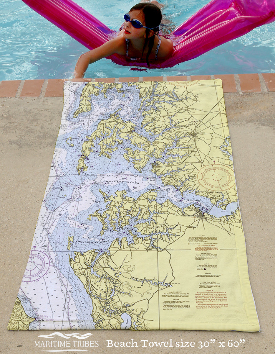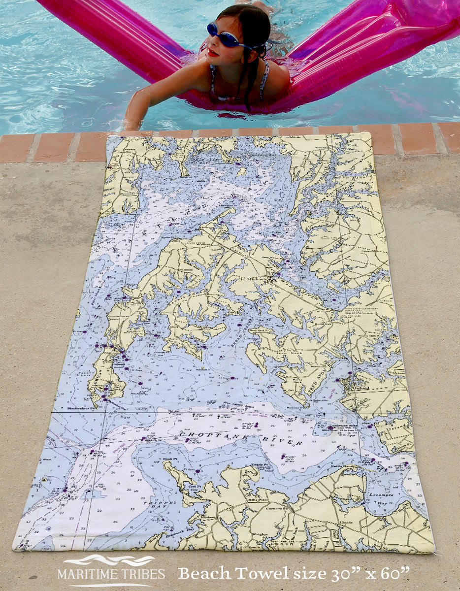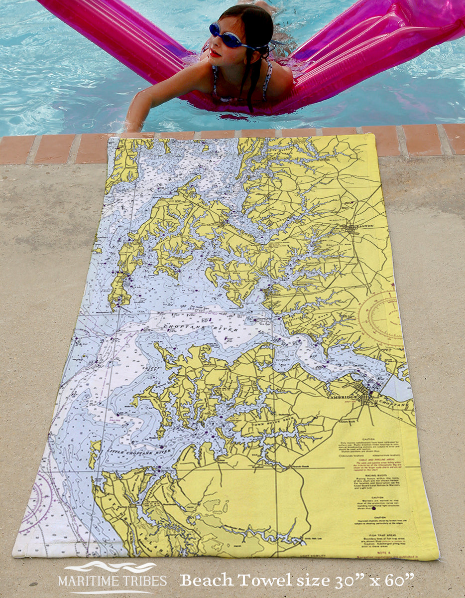 Maryland’s maritime identity is inseparable from the Chesapeake Bay, its rivers, and the towns that have grown along their shores for centuries. From the bustling harbor of Baltimore to historic waterfronts like Annapolis, St. Michaels, Oxford, and Cambridge, the state’s coastal life is shaped by sailing, fishing, and trade. Our Maryland collection features vintage nautical charts and coastal maps transformed into cozy blankets, scarves, towels, placemats, and home accents—each one celebrating a specific place by the water.