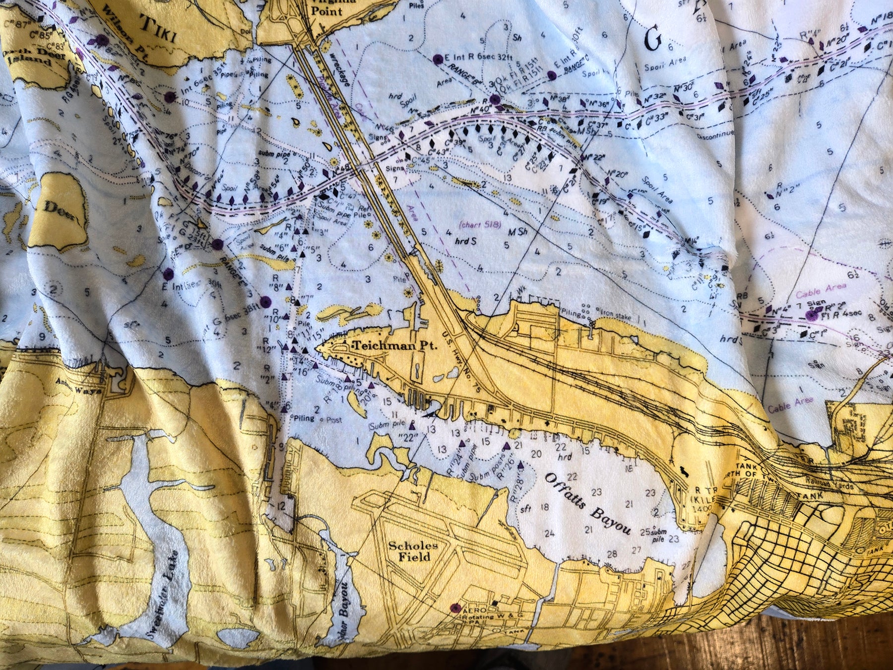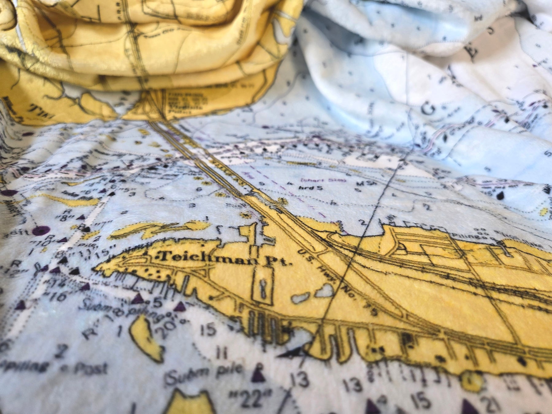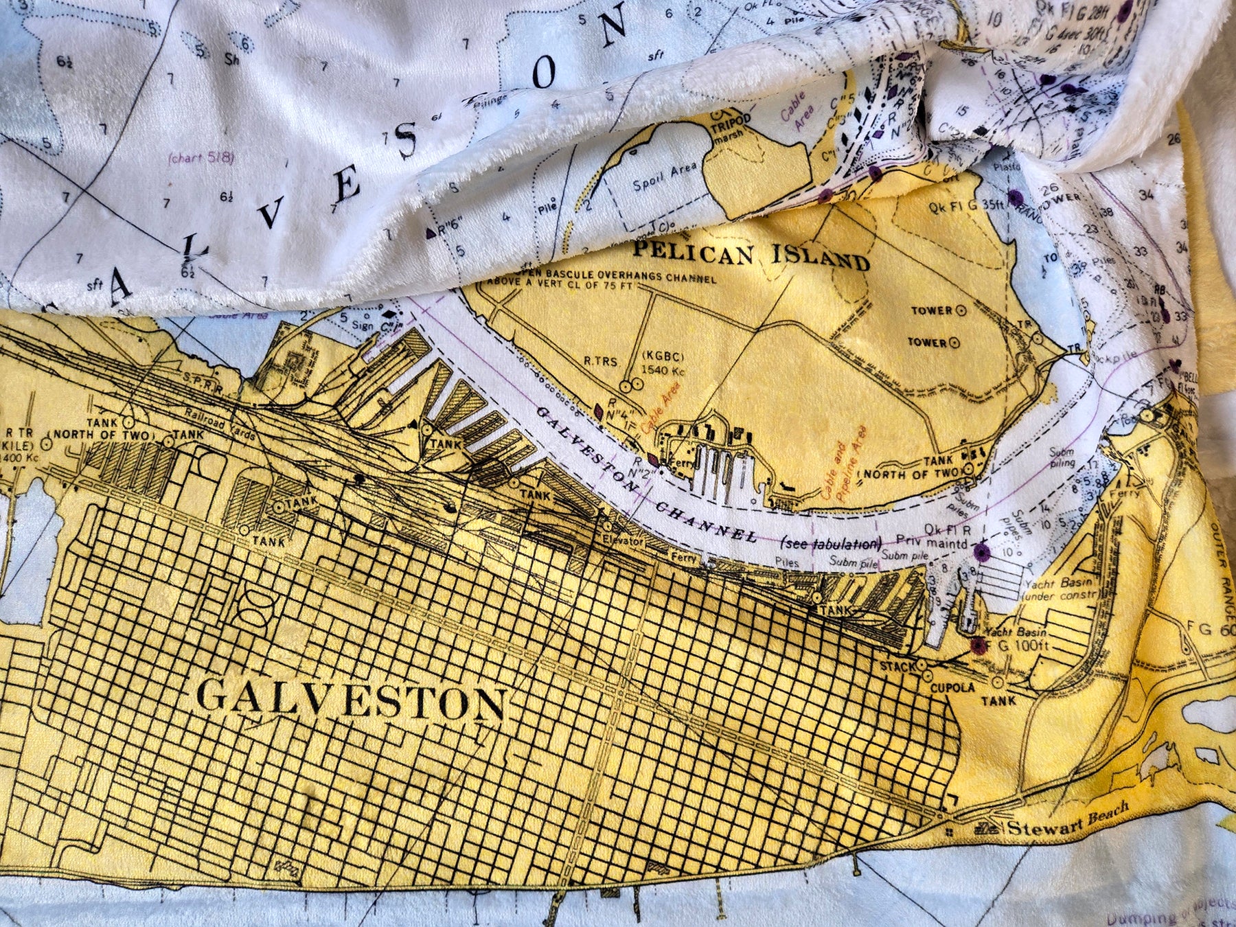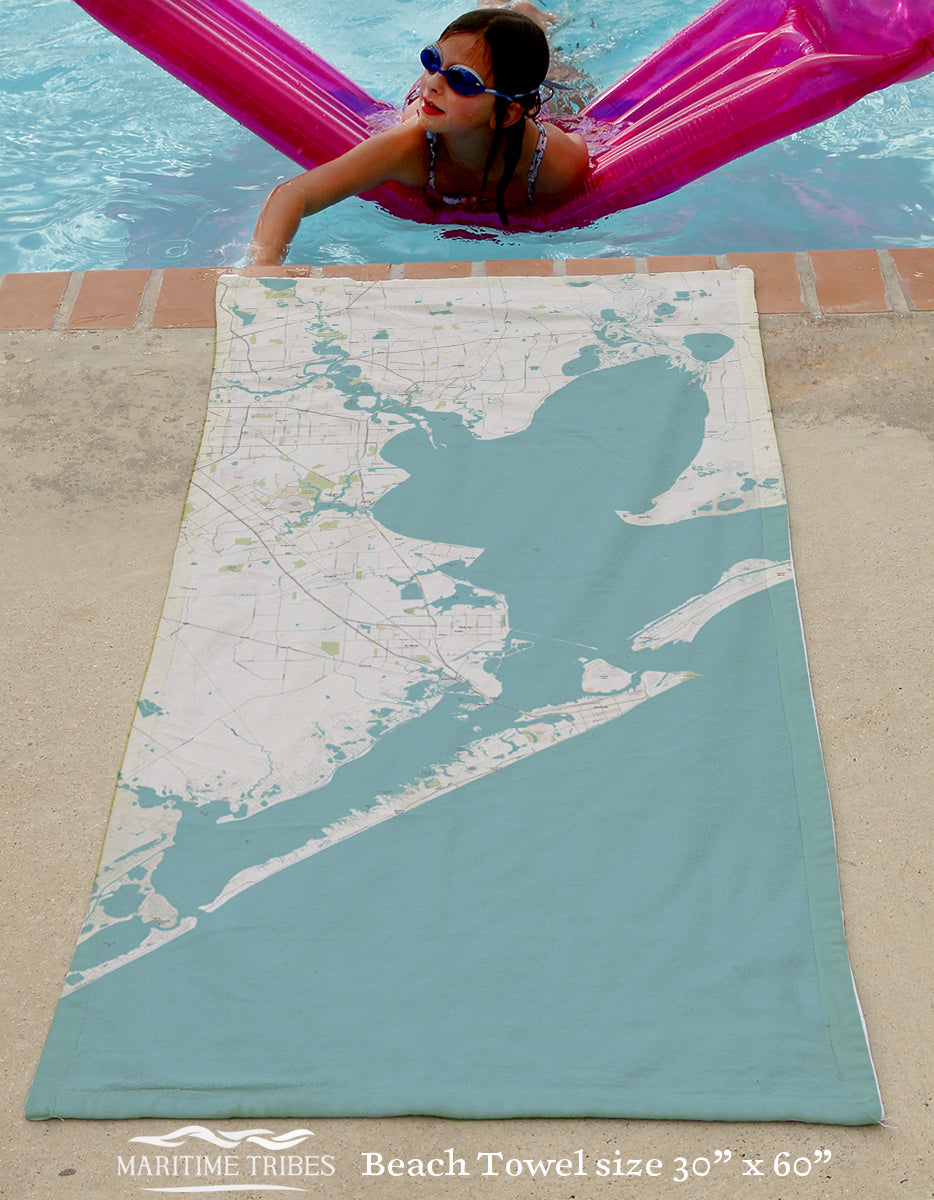 Texas’ coastline stretches along the Gulf of Mexico, shaped by wide bays, barrier islands, and major working ports that play a vital role in the state’s economy and culture. From busy shipping channels to open coastal waters, Texas’ maritime identity blends industry, recreation, and a deep connection to life on the water. Our Texas collection features vintage nautical charts and coastal maps transformed into cozy blankets, scarves, towels, placemats, and home accents—each one tied to a specific place by the sea.