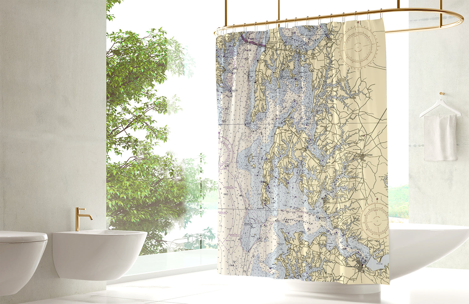 Celebrate the coastal character of Chesapeake Bay with this nautical chart shower curtain. Featuring detailed waterways, nearby towns, and classic maritime charm, it adds a unique focal point to any bathroom.