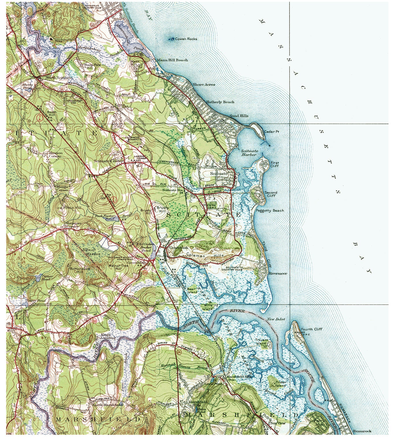 - Charming Design: Featuring a detailed and vintage-style topographic map of Scituate, down to Fourth Cliff and North River.